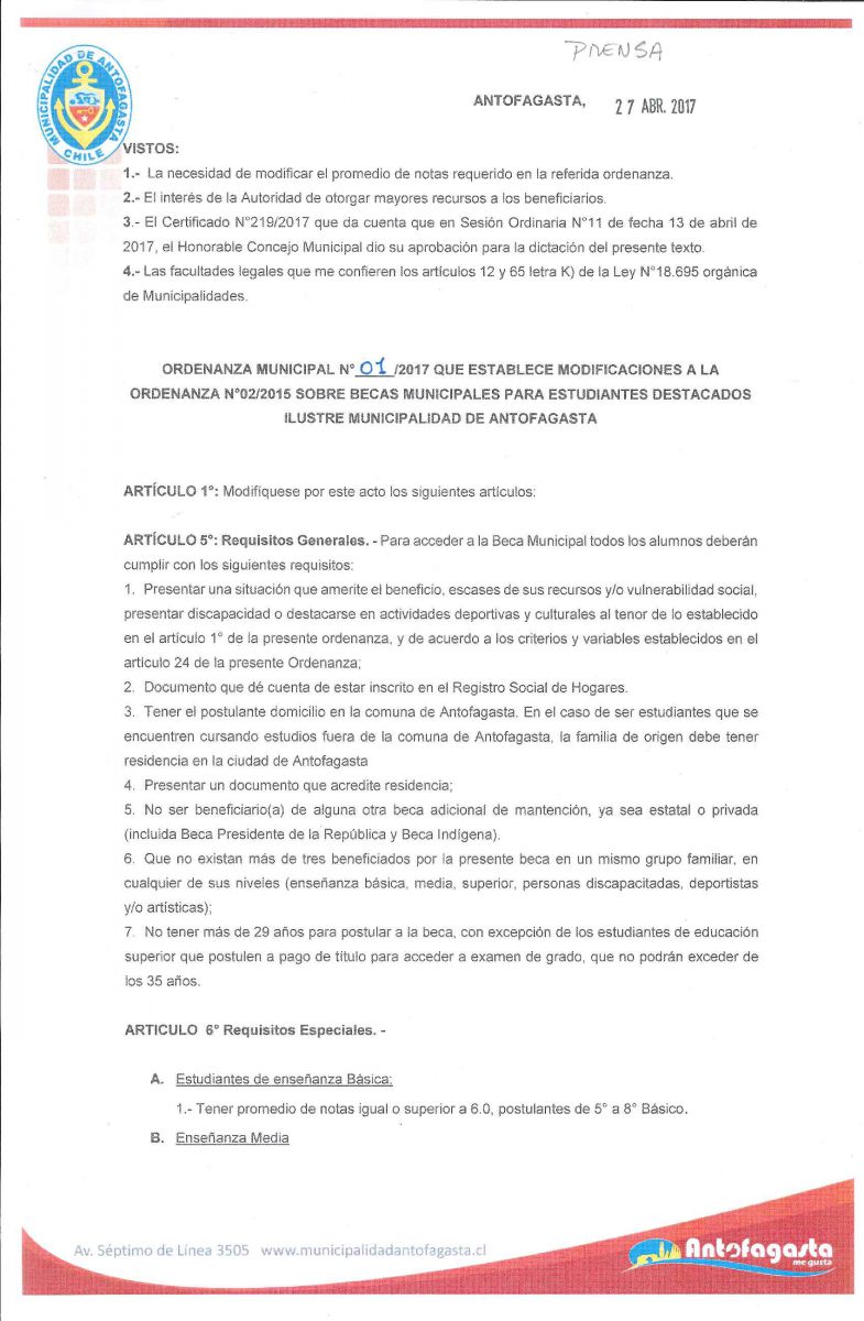 ORDENANZA MUNICIPAL N° 01/2017 QUE ESTABLECE MODIFICACIONES A LA ORDENANZA N°02/2015 SOBRE BECAS MUNICIPALES PARA ESTUDIANTES DESTACADOS ILUSTRE MUNICIPALIDAD DE ANTOFAGASTA