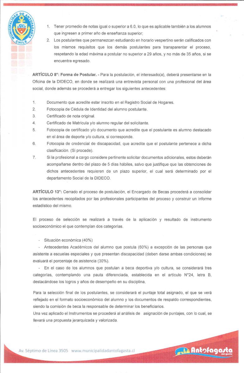 3. Tener el postulante domicilio en la comuna de Antofagasta. En el caso de ser estudiantes que se encuentren cursando estudios fuera de la comuna de Antofagasta, la familia de origen debe tener residencia en la ciudad de Antofagasta