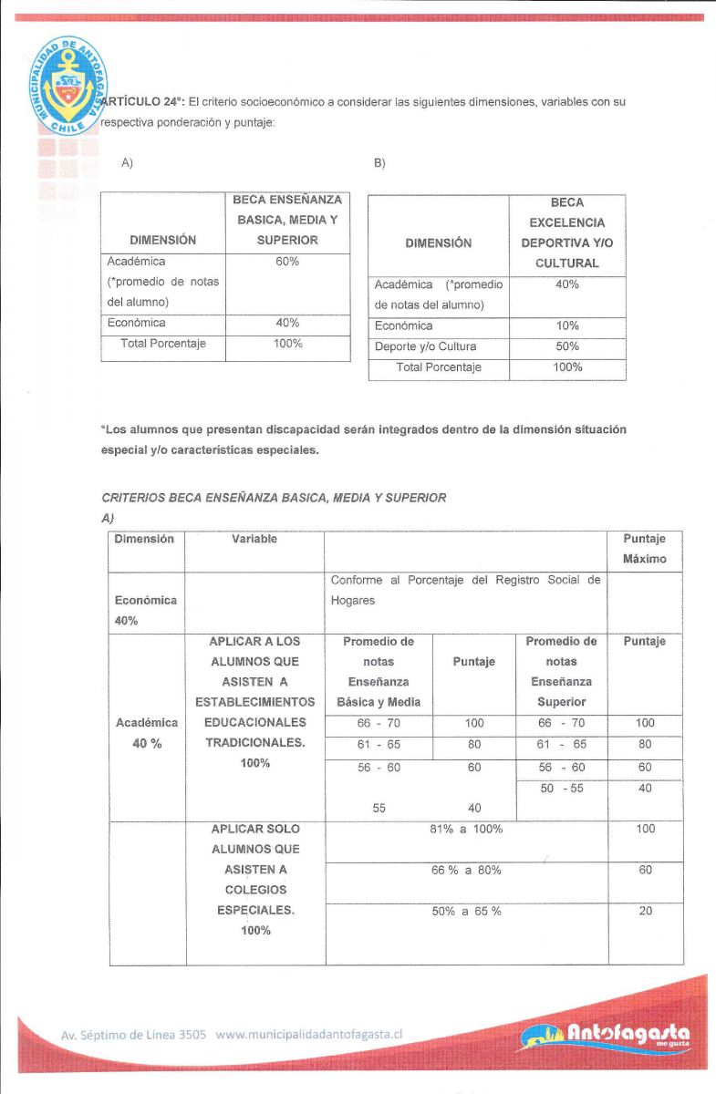 1. Presentar una situación que amerite el beneficio, escases de sus recursos y/o vulnerabilidad social, presentar discapacidad o destacarse en actividades deportivas y culturales al tenor de lo establecido en el artículo 1° de la presente ordenanza, y de acuerdo a los criterios y variables establecidos en el artículo 24 de la presente Ordenanza;