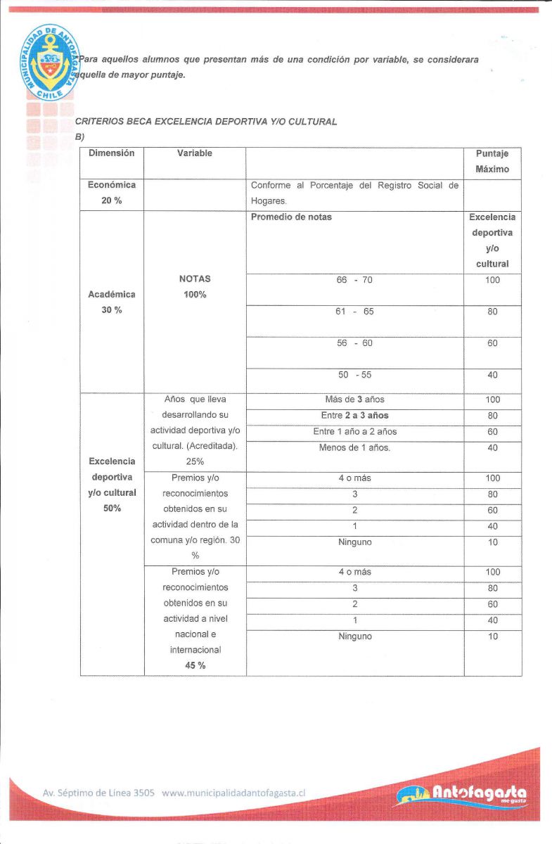 - En el caso de los alumnos que postulan a beca deportiva y/o cultura, se considerará tres categorías, contemplando una pauta diferenciada, establecida en el artículo N°24, letra B, destacándose los logros y años de desempeño en su disciplina,