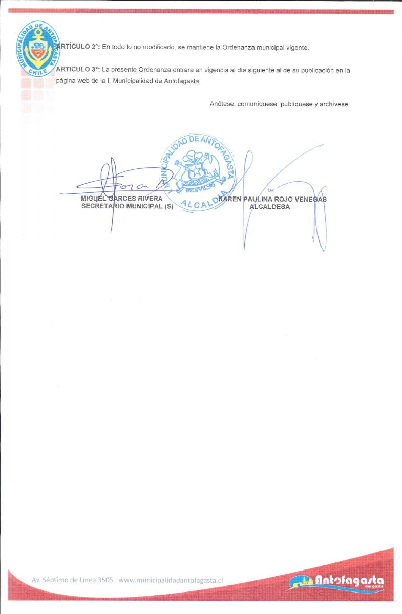 ARTICULO 3°: La presente Ordenanza entrara en vigencia al día siguiente al de su publicación en la página web de la I. Municipalidad de Antofagasta.