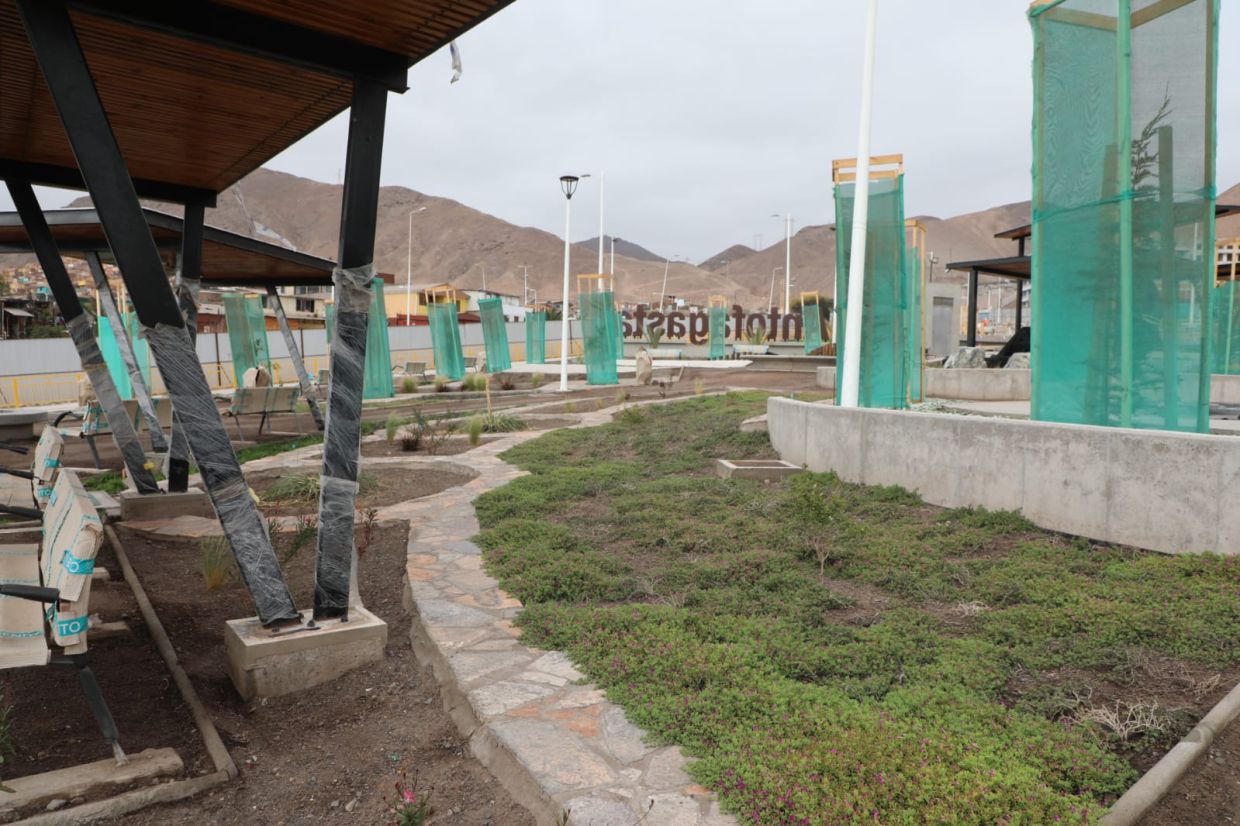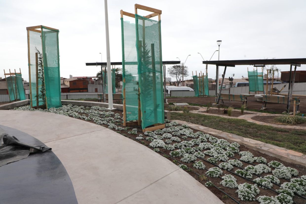 El inspector técnico de la Dirección de Obras Municipales, Sergio Collao, precisó que el proyecto cuenta con un 92% de avance en las obras civiles y un 72% en el área verde. "Actualmente estamos en la etapa final de limpieza y corrección de observaciones, además de realizar gestiones administrativas con Aguas Antofagasta y CGE. La Plaza ya cuenta con sus equipamientos instalados, áreas de juego y bicicletero habilitados", detalló el profesional. | Por su parte, la inspectora técnica de la Dirección de Medio Ambiente, Pamela Gahona, destacó la elección de especies vegetales sustentables, "contamos con más de 6 mil 700 metros cuadrados de césped y una variada composición de especies como Alyssum, cubresuelo rastreras, doquillas, romero, datilera y frutales. Todas fueron seleccionadas por su bajo requerimiento hídrico, lo que permite un mantenimiento eficiente y sostenible".