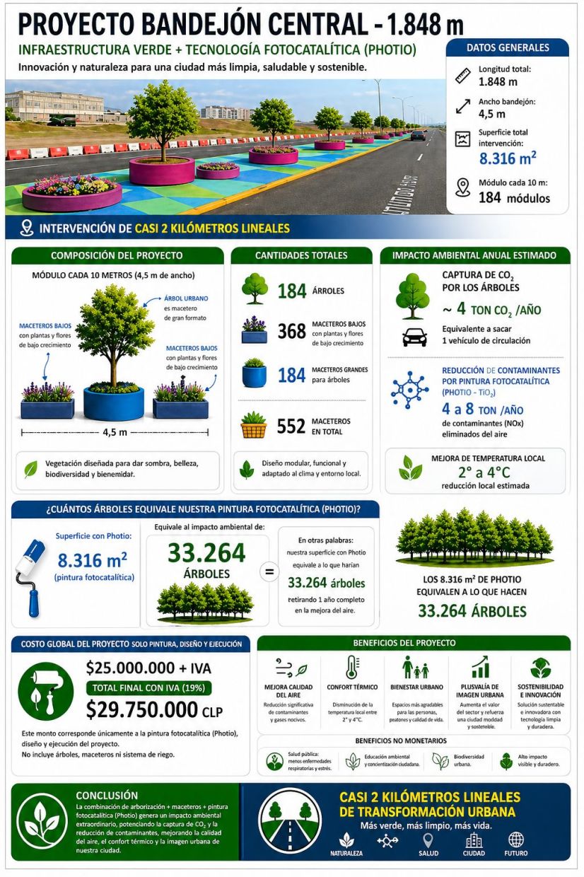 Los trabajos, que implican una inversión de $29.750.000, consideran también el pintado del bandejón central con la tecnología fotocatalíca (photio) en un área de 8.316 m2, sistema que permite la captura de CO2 y la reducción de contaminantes, mejorando la calidad del aire, reduciendo la temperatura entre 2 y 4 grados, equivalente a 33.264 árboles en total.