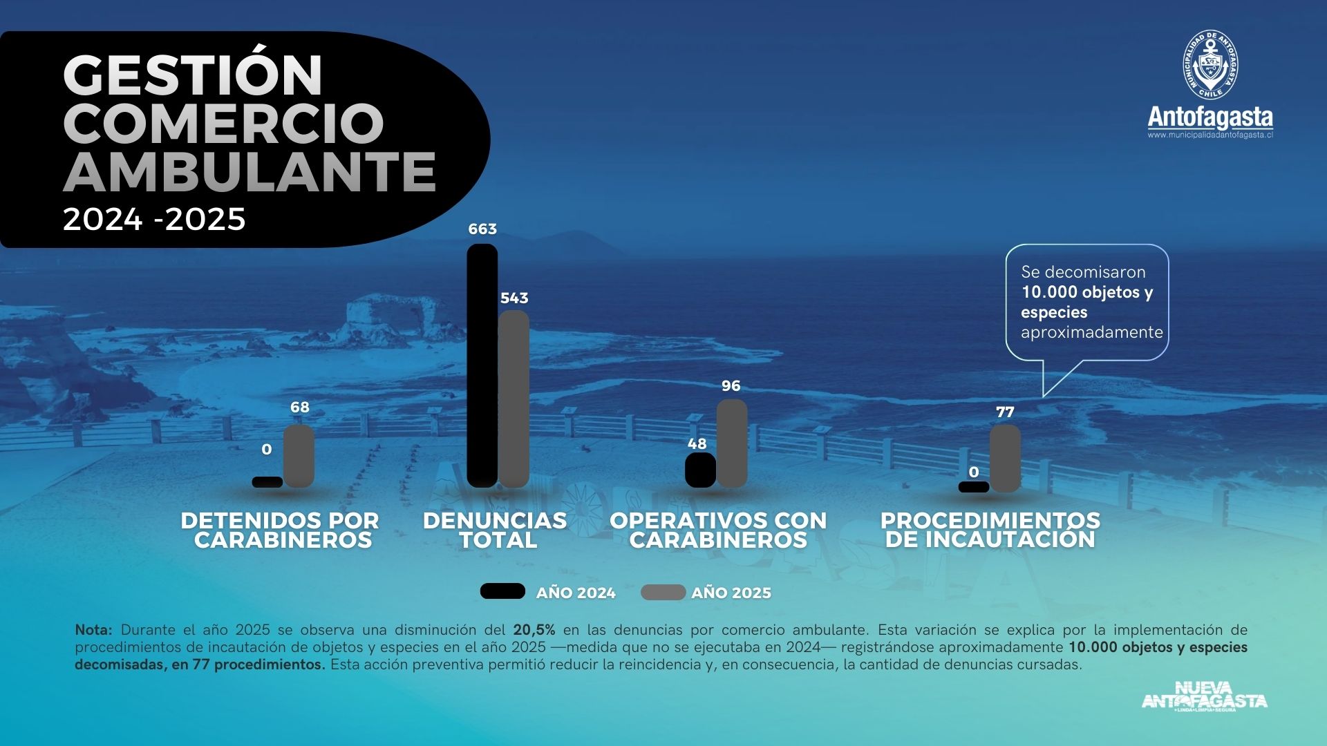 Pasar de no registrar detenidos ni incautaciones en 2024, a 68 personas arrestadas y 77 decomisos —con más de 10 mil especies retiradas— durante 2025, evidencia importantes avances en el control del comercio ambulante, gracias al trabajo conjunto y coordinado entre la Municipalidad de Antofagasta y Carabineros.