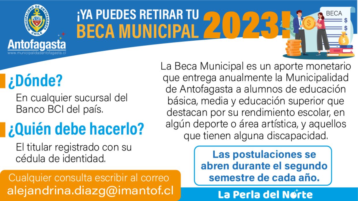 La Beca Municipal es un aporte monetario que entrega anualmente la Municipalidad de Antofagasta, a través de la Unidad de Subsidio y Becas de la Dirección de Desarrollo Comunitario, a alumnos de educación básica, media y educación superior que destacan por su rendimiento escolar, en algún deporte o área artística, y aquellos que tienen alguna discapacidad.