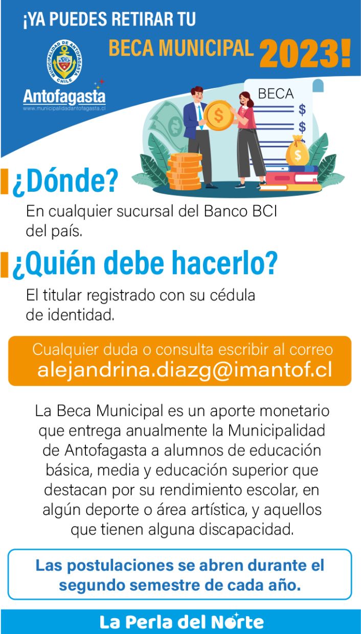 La Beca Municipal es un beneficio que la Municipalidad de Antofagasta entrega todos los años a estudiantes de diferentes establecimientos educacionales, ya sea municipal, subvencionado o particular.