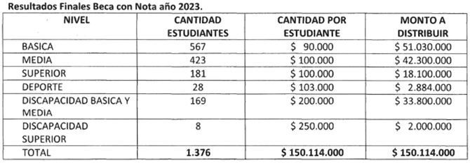 Este año se entregarán $150.214.000 repartidos en un total de 1.377 alumnos beneficiados. Revisa la tabla con los resultados finales: