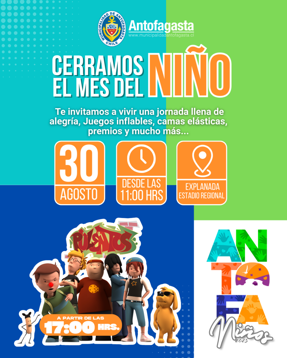| El alcalde Sacha Razmilic comentó "queremos hacer una invitación este sábado a partir de las 11:00 de la mañana en la explanada norte del Estadio Regional. Vamos a cerrar el Mes del Niño con una actividad muy entretenida con juegos, show, entretención para los niños y sus familias (...) A las 5 de la tarde vamos a tener, ni más ni menos que a "Los Pulentos", para el cerra el Mes del Niño con mucho cariño de parte del municipio para ustedes". | Durante toda la jornada habrá juegos, actividades recreativas, presentaciones artísticas y sorpresas para que los más pequeños disfruten junto a sus familias.