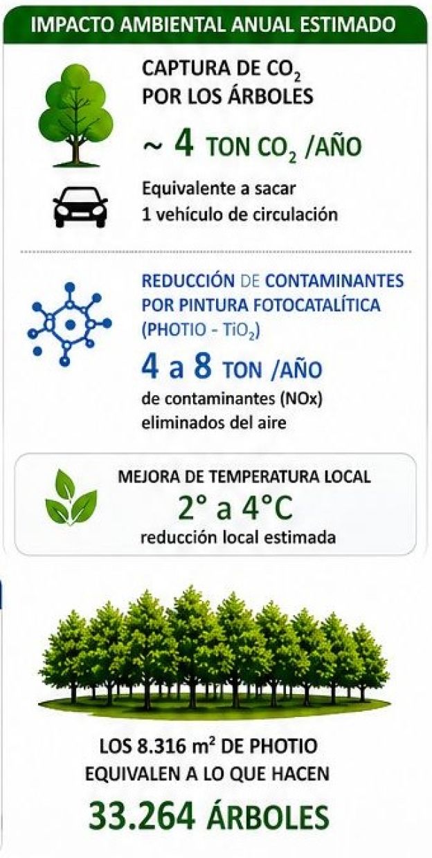Los trabajos, que implican una inversión de $29.750.000, consideran también el pintado del bandejón central con la tecnología fotocatalíca (photio) en un área de 8.316 m2, sistema que permite la captura de CO2 y la reducción de contaminantes, mejorando la calidad del aire, reduciendo la temperatura entre 2 y 4 grados, equivalente a 33.264 árboles en total.