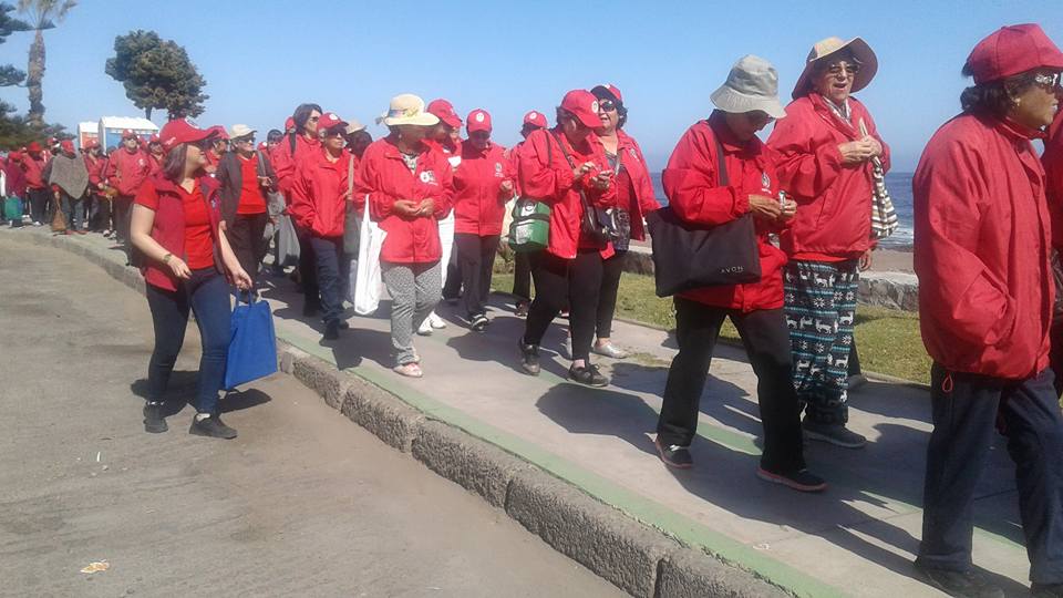 | Más de 100 abuelitos participaron este miércoles en una extensa caminata por la Avenida Ejército hasta el recién inaugurado Parque Croacia, la iniciativa de la Municipalidad de Antofagasta a través de su programa Adulto Mayor tuvo como fin de demostrar a la comunidad que existe una comunidad activa y participativa que a pesar de sus años, se mantienen con vitalidad y pueden realizar masivas actividades. En la oportunidad los usuarios participaron de una jornada de ejercicios de estiramiento y relajación, gimnasia entretenida al aire libre y zumba, que contó con puntos de hidratación y alimentación saludables. Los usuarios del programa municipal, comentaron sus sensaciones: “Muy buena iniciativa, excelente, es algo que deberíamos hacer más constantemente muy entretenido; “Esto nos sirve a nosotros mucho porque si no hubiera esto estaríamos en la casa, gracias a los monitores, ojalá sigamos por mucho tiempo más”; “excelente muy bonito, todo muy bien organizado”, finalizaron los felices tatitas. | La actividad tuvo como punto de partida la plaza de la Avenida Ejército, siguiendo el recorrido por el sector sur, para concluir con un acto en el Parque Croacia donde fueron recibidos por todo el programa municipal con concursos, sorpresas y entretenidas coreografías que hicieron vibrar a los abuelitos. Según lo indicó, la Coordinadora del Programa Adulto Mayor, Myriam Ochoa, la actividad tenía como finalidad celebrar el mes del adulto mayor y, también, "demostrar a toda la ciudadanía que las personas de la tercera edad son muy importantes para el desarrollo de la comuna y aún tienen mucho que entregarle a las próximas generaciones". Ochoa agregó que "con esta caminata queremos manifestar que Antofagasta es una comuna alegre y que quiere a sus abuelos, los respeta y los considera, además de dejar claro que ellos están vitales y en muy buen estado físico". En la caminata participaron los integrantes de las dos casas del adulto mayor que existen en la Comuna, en donde reciben capacitación en cultura, educación, manualidades, deporte y recreación. |
