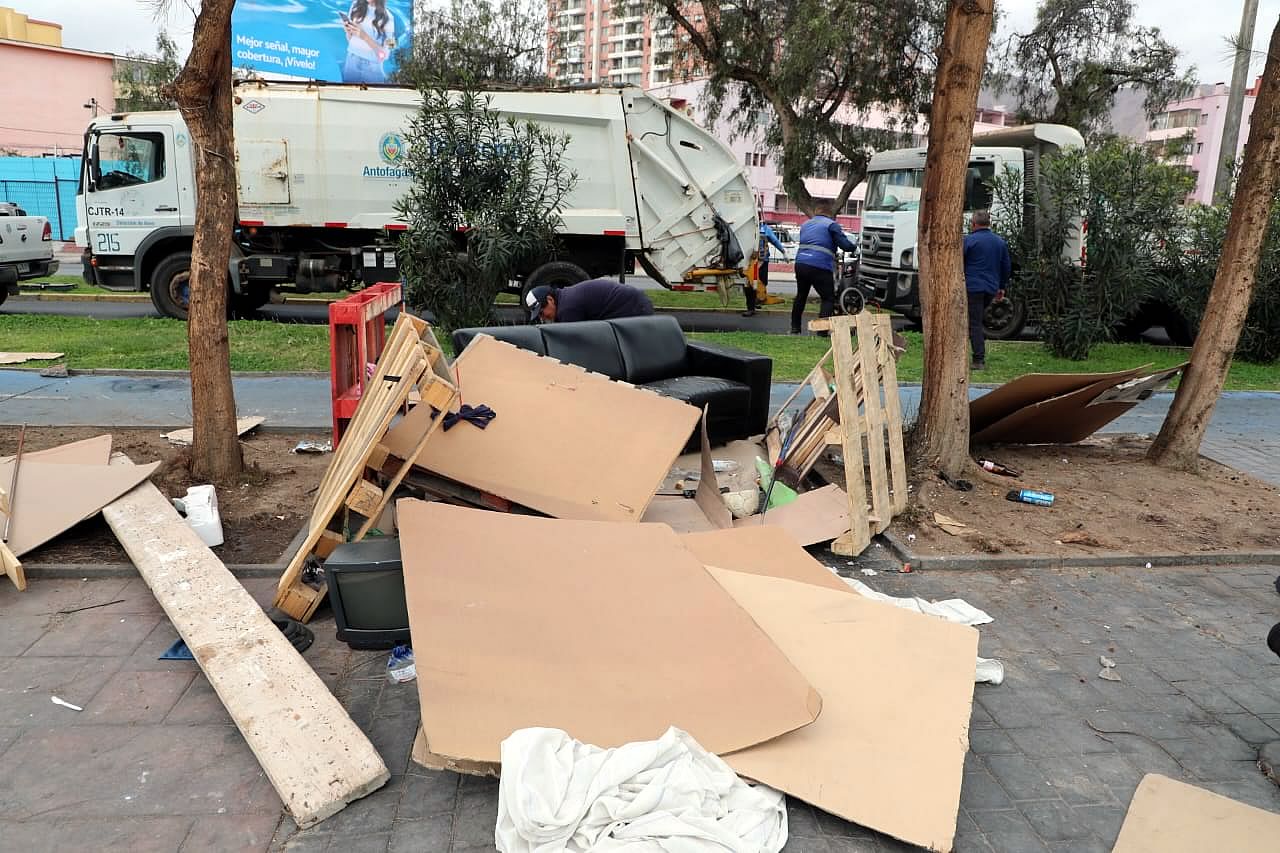 Un total de siete rucos fueron retirados, dos veces en menos de 24 horas, por personal de la Municipalidad de Antofagasta con el apoyo de Carabineros desde el bandejón central ubicado frente al sector del mall.